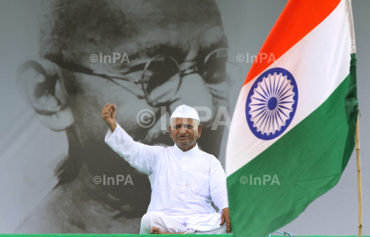 Social activist Anna Hazare sits in the backdrop of a portrait of Mahatma Gandhi at the venue of a public hunger strike in New Delhi, India, Friday, Aug. 19, 2011. Hazare began the strike and mass protest Friday, adopting the tactics of liberation hero Mahatma Gandhi to push for government reform. Photo Credit: Indian Photo Agency