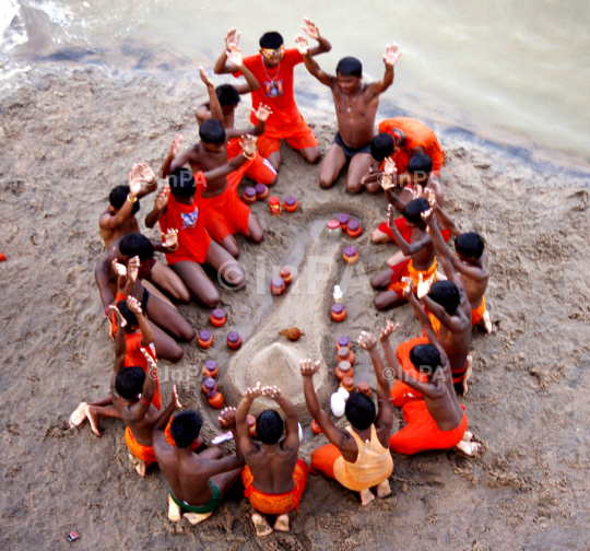 Kanvar Yatra: Hindu devotees (Kanwar pilgrimage) perform ritual after making a sand Shivling in Purulia, West Bengal, India on Aug 04, 2013. Photo by Amit Singha Deo/Indian Photo Agency (InPA)