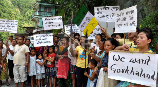 Supporters of Gorkha Janmukti Morcha (GJM) shout slogans during strike Kalimpong near Siliguri, West Bengal, India on Sunday Aug 04, 2013. (GJM) have called an indefinite stirike in Darjeeling and nearby hill areas following the decision by the Congress Party leadership in approving the creation of the southern state of Telangana from Andhra Pradesh. The GJM is demanding a separate Gorkhaland state within India for the Gorkha people in northern West Bengal. Photo by Lila Sah/Indian Photo Agency (InPA)