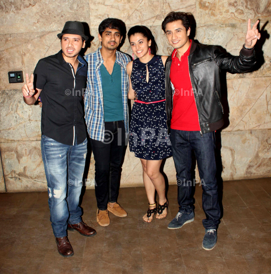 Bollywood actors Divyendu Sharma, Siddharth, actress Taapsee Pannu with Pakistani actor-singer Ali Zafar during the premiere of film "Chashme Baddoor" in Mumbai, India on April 04, 2013. Photo Credit: Indian Photo Agency (InPA)