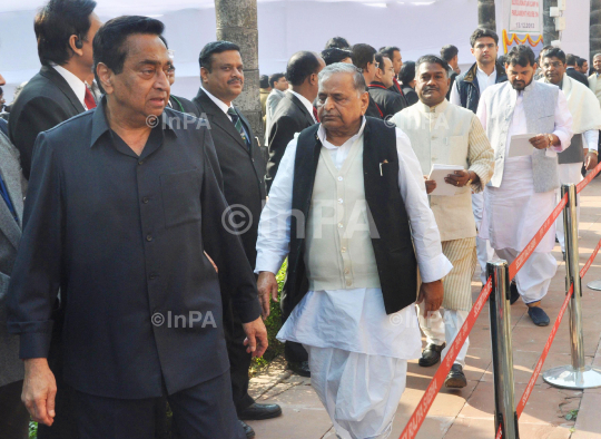 SP Chief , Mulyam SIngh Yadav with Congress Minister, Kamal Nath during pay homage a remembrance ceremony of the 2001 Parliament attack, at Parliament House in New Delhi on December 13, 2012.