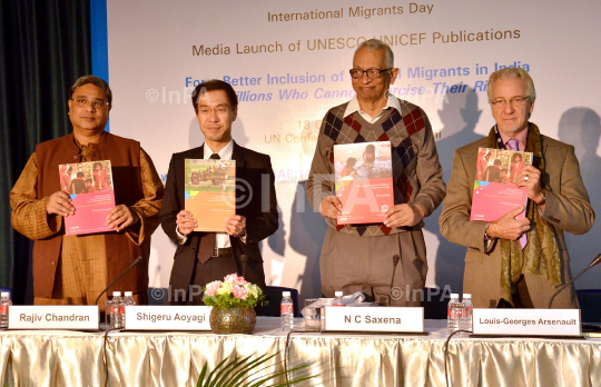Shigeru Aoyagi, Director and Representative, UNESCO with NC Saxena, Rajiv Chandran, Louis-Georges Arsenault launching UNESCO-UNICEF publications from the Internal Migration in India Initiative (IMII) in New Delhi on Dec 18, 2012. Photo Credit: Indian Photo Agency