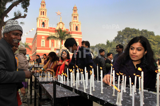 Christians light candles and pray during the Christmas celebration at the Sacred Heart Cathedral in New Delhi, India, Wednesday, Dec. 25, 2003. Christians celebrate Christmas Day as the anniversary of the birth of Jesus of Nazareth, a spiritual leader whose teachings form the basis of their religion. Photo Credit: Indian Photo Agency