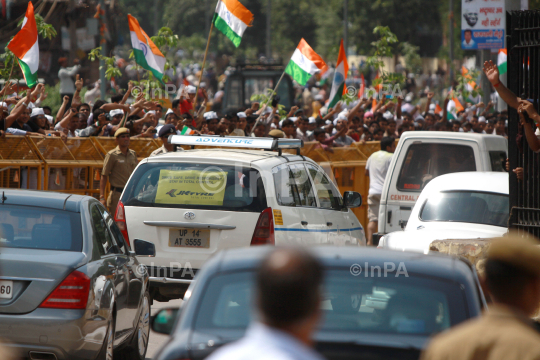 Indian reform activist Anna Hazare in centre car, is taken to a hospital after he broke his fast in New Delhi, India, Sunday, Aug. 28, 2011. Hazare, whose protest galvanized the nation's anger against corruption, ended his 12-day hunger strike Sunday after forcing Parliament to throw its weight behind his crusade. Photo Credit: Indian Photo Agency