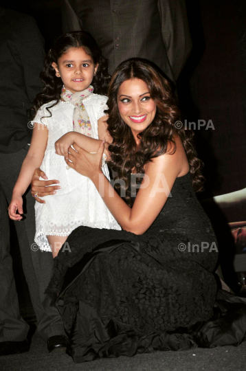 Bollywood actress Bipasha Basu with child actress Doyel Dhawan during the first look of upcoming psychological thriller film "Aatma" in Mumbai, India on February 11, 2013. Photo Credit: Indian Photo Agency (InPA)