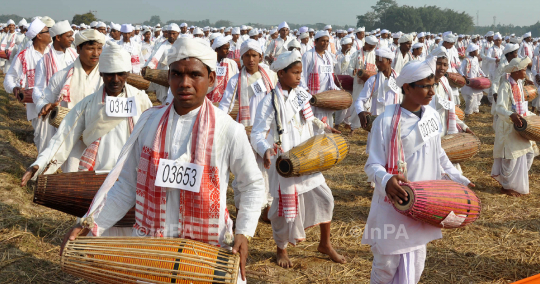 Participants take part in a play "Khol" an Assamese Traditional musical instrument, in an aim to create a Guinness World Record at Mejenga Pathar, Titabor in Jorhat District some 305km from Guwahati on January 6, 2013. About 15,000 participants perform Khol to create a Guniess World Record. Photo by Dasarath Deka/Indian Photo Agency