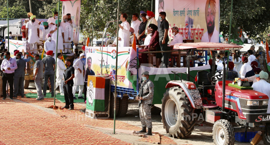 Congress leaders Rahul Gandhi during a Tractor Yatra along with Chief Minister Captain Amarinder Singh to stand in solidarity with the farmers protesting against the newly acted agricultural laws as part of his Kheti Bachao campaign in Moga district, Punjab, India, on, Oct. 04, 2020. Photo Credit: Indian Photo Agency (InPA)