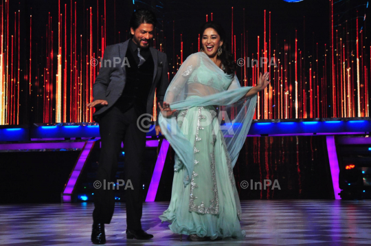 Bollywood actors Shahrukh Khan and Madhuri Dixit Nene on the sets of Jhalak Dikhla Jaa during the promotion of film Chennai Express, in Mumbai, India on July 3, 2013. Photo Credit: Indian Photo Agency (InPA)