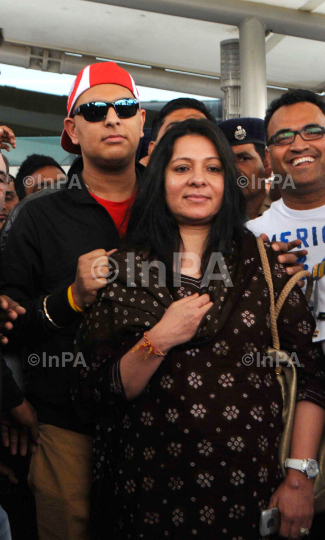 Indian cricket star Yuvraj Singh with his mother Shabnam on arrival at the airport in New Delhi, India, Monday, April 9, 2012. Singh returned to India after undergoing treatment for cancer at a hospital in the United States. Photo Credit: Indian Photo Agency