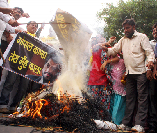 Hundreds of party members of BJP and Haryana Janhit Congress activists burning an effigy of former Haryana Minister of State for Home Affairs Gopal Kanda as a case was registered against him in Delhi in connection with the suicide of a 23-year-old former air hostess of MDLR airlines Gitika Sharma, in Gurgaon, India, on, August 07, 2012. Photo Credit: Indian Photo Agency