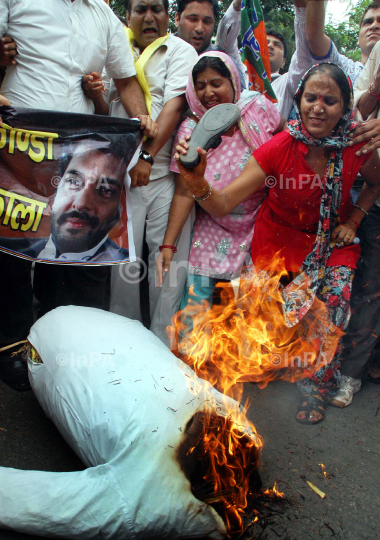 Hundreds of party members of BJP and Haryana Janhit Congress activists burning an effigy of former Haryana Minister of State for Home Affairs Gopal Kanda as a case was registered against him in Delhi in connection with the suicide of a 23-year-old former air hostess of MDLR airlines Gitika Sharma, in Gurgaon, India, on, August 07, 2012. Photo Credit: Indian Photo Agency