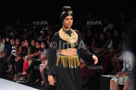 A model displays an outfit by fashion designer Nitya Arora from the Valliyan collection during the Lakme Fashion Week 2012 Winter/Festive, in Mumbai, India on August 6, 2012. Photo Credit: Indian Photo Agency
