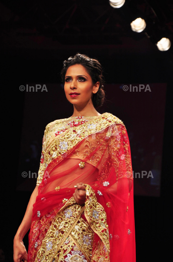 A model displays creation by fashion designer Bhairavi Jaikishan during the Lakme Fashion Week 2012 Winter/Festive, in Mumbai, India on August 6, 2012. Photo Credit: Indian Photo Agency