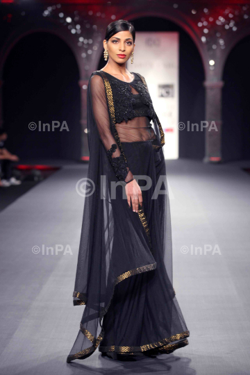 A model displays a creation by Varun Bahl during the PC Jewelers Delhi Couture week, in New Delhi, India, Wednesday, Aug. 8, 2012. Photo Credit: Indian Photo Agency