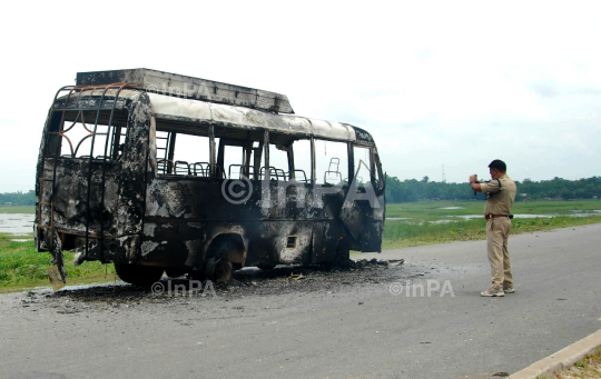 A torched vehicle on the road which was torched by the protestor at Bhatkuchi under Kamrup district as a part of ethnic violence in BTAD area and burn of nano vehicle at Gandhibari under Baska district yesterday at Rangia on Thursday 16th August 2012.Curfew had been imposed at Rangia. Photo by Dasarath Deka/Indian Photo Agency