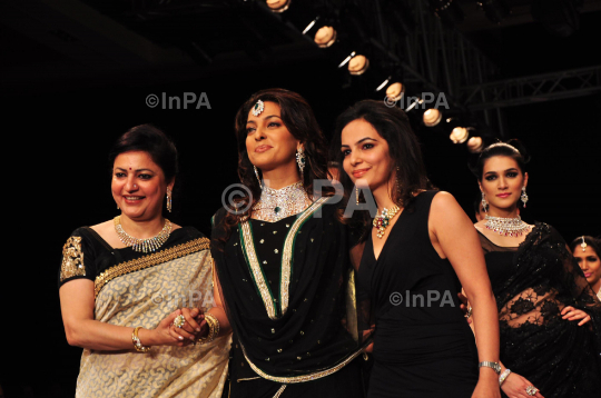 Bollywood actress Juhi Chawla walks the ramp displaying jewellery by Kays Jewels at the India International Jewellery Week 2012 (IIJW) in Mumbai on August 21, 2012. Photo Credit: Indian Photo Agency