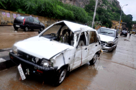 A damaged vehicle due to heavy rain in Jaipur, Rajasthan, India on Aug 22, 2012. Twelve persons have died and many have been evacuated from their homes due to heavy rains today in Rajasthan where the incessant downpour has brought normal life to a standstill. Photo by Prakash Sharma/Indian Photo Agency