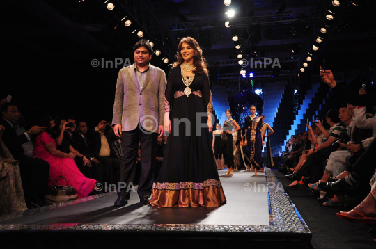 Bollywood actress Madhuri Dixit walks the ramp to display jewellery during the grand finale of India International Jewellery Week in Mumbai, India on August 23, 2012. Photo Credit: Indian Photo Agency