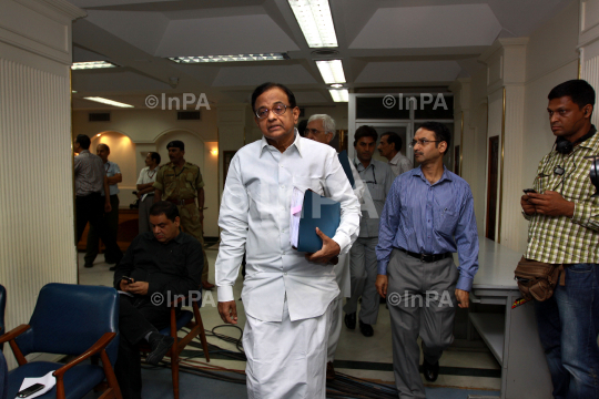 Indian Finance Minister P Chidambaram arrives a press conference expressing dismay that the opposition was not allowing for a debate on the CAG report on coal block allocation losses in New Delhi on August, 24, 2012. Photo Credit: Indian Photo Agency