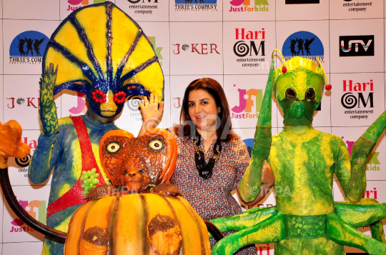 Bollywood actress and choreographer Farah Khan with the aliens during the promotion of her upcoming film "Joker" in Mumbai on August 24, 2012. Photo Credit: Indian Photo Agency