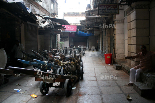 Handcarts at the closed Mangaldas market in Mumbai on December 1, 2011. Shopkeepers and traders in India went on a one-day strike December 1 as the main opposition party stepped up protests against plans to open the country's retail sector to foreign chains. Prime Minister Manmohan Singh's government has been faced with widespread fury over its decision last week to allow supermarket giants such as Wal-Mart to own 51-percent of large "multi-brand" stores. Photo by Sachin Halde/Indian Photo Agency