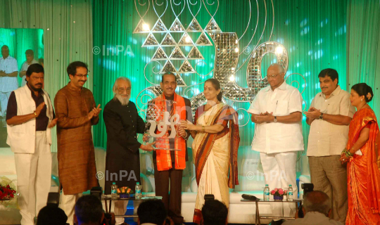(L to R) Ramdas Athawale, President of the Republican Party of India (Athawale), Uddhav Thackeray, Shiv Sena executive president, Babasaheb Purandare, Historian, Manohar Joshi, former Chief Minister of Maharashtra, Lok Sabha Speaker and Shiv Sena leader, Anagha Joshi wife of Manohar Joshi, Sharad Pawar, President of Nationalist Congress Party, Nitin Gadkari, President of Bharatiya Janata Party (BJP) and Shraddha Jadhav, Mayor of Mumbai on Manohar Joshi's 75th birthday celebrations in Mumbai, India on 02/12/2011. Photos by Sachin Halde/Indian Photo Agency