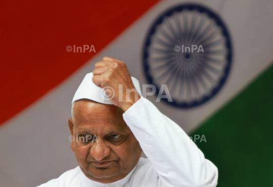 Indian anti-corruption activist Anna Hazare, during his day long fast, in New Delhi, India, Sunday, Dec. 11, 2011. Indian anti-corruption crusader Anna Hazare, whose campaign in August attracted massive public support, held a one-day fast December 11 demanding the government do more to crack down on crooked officials. Hazare returned to New Delhi for a one-day symbolic fast to protest against the government's draft of a new anti-corruption law, which he said was "toothless" legislation that exempted many key officials. Photo Credit: Indian Photo Agency