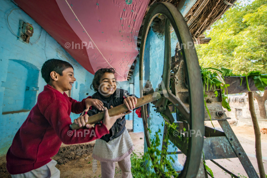 Village Life, Daily Life of farmers: Farmer's children cutting grass with a grass cutting Machine for their cow, at a village Mau Nakhat near Ghatampur, Kanpur, Uttar Pradesh, India, on, Dec. 28, 2020. Photo by Shailendra Pandey/Indian Photo Agency (InPA)