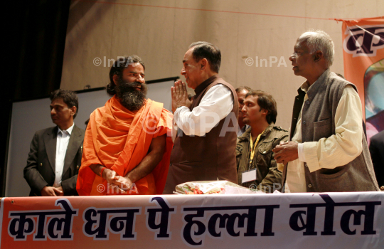 Janata Party President Subramanian Swamy and yoga guru Baba Ramdev with KN Govindacharya, former BJP General Secretary, RSS Ideologu during an event against corruption in New Delhi, India, Saturday, Feb. 4, 2012. Judge OP Saini dismissed Swamy's petition plea for trial of Home Minister P Chidambaram along with former telecommunications minister A Raja who was forced to resign last year because of a multibillion-dollar telecoms scandal and later arrested by police. Two days ago, India's top court ruled that the 122 licenses granted in the 2008 deal be scrapped. Photo Credit: Indian Photo Agency