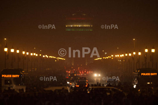 Illuminated Raisina hills: Indian President Pranab Mukherjee leaves after an event to announce the end of the Republic Day celebrations with Beating Retreat ceremony in New Delhi, India on January 29, 2017. Photo Credit: Indian Photo Agency (InPA)