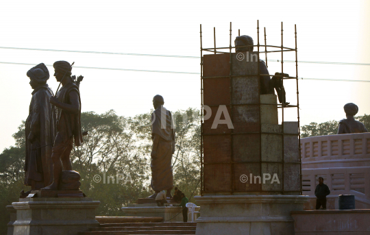 Indian workers cover a statue of Chief Minister of Uttar Pradesh state Mayawati at Ambedkar Park in Noida, Uttar Pradesh on the outskirts of New Delhi, India, Tuesday, Jan. 10, 2012. Workmen using truckloads of cloth raced to comply with election officials who ordered the statues of Chief Minister of Utter Pradesh state Mayawati, who is a hero to India's lowest castes, along with nearly 200 statues of elephants, her party's symbol, be covered. Photo Credit: Indian Photo Agency