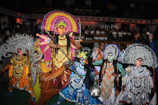 Folk dances of india: Artists performing during inauguration of the 17th National Youth Festival by lighting the lamp to mark 150th birth anniversary of Swami Vivekananda in Mangalore on 12/01/2012. Festival, began with a colourful procession from Nehru Maidan witnessed beautiful ceremony at Mangala Stadium where the procession had earlier culminated. Photo by RK Bhat/Indian Photo Agency