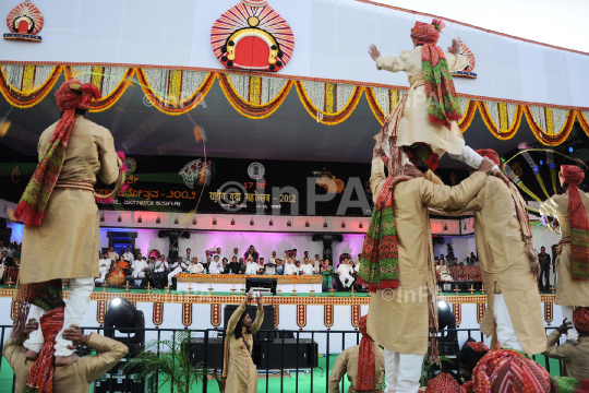 Folk dances of india: Artists performing during inauguration of the 17th National Youth Festival by lighting the lamp to mark 150th birth anniversary of Swami Vivekananda in Mangalore on 12/01/2012. Festival, began with a colourful procession from Nehru Maidan witnessed beautiful ceremony at Mangala Stadium where the procession had earlier culminated. Photo by RK Bhat/Indian Photo Agency