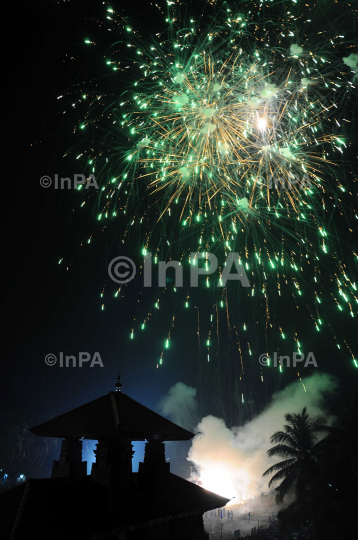Chinese Fireworks during Paryaya festival marking the take over of Pooja rights of Lord Krishna, at Srikrishna Temple, by the Sode Mutt pontiff Vishwavallabha Theertha in Udupi, Karnataka, India on 18/01/2012. Photo by RK Bhat/Indian Photo Agency