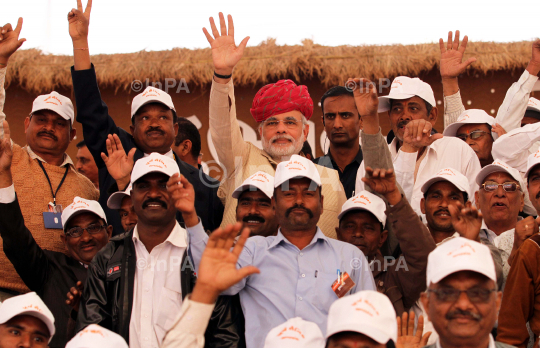 Gujarat's Chief Minister Narendra Modi during his 24th Sadbhavana mission fast at Himmatnagar in Sabarkantha district, Gujarat, India, on January 22, 2012. He announced a package of Rs 2380 crore for Sabarkantha district. Photo Credit: Indian Photo Agency