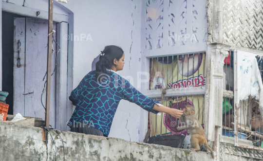An Indian girl feeds to a monkey as Ayodhya prepares for grandeur as PM Narendra Modi and other eminent dignitaries set to visit the temple town for Bhoomi Pujan of Ram Mandir, in Ayodhya, India, Aug 01, 2020. Photo Indian Photo Agency (InPA)