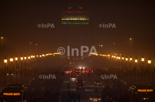 Illuminated India Gate in Tricolour (Tiranga) during an event to announce the end of the Republic Day celebrations with Beating Retreat ceremony in New Delhi, India on January 29, 2017. Photo Credit: Indian Photo Agency (InPA)