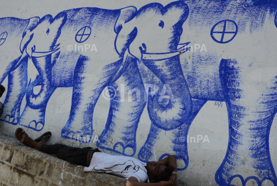 A young man sleeping as the painting of the elephant seen on the wall in Bhopal, Madhya Pradesh, India on May 13, 2021. Photo Credit: Indian Photo Agency (InPA)