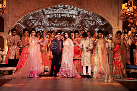Bollywood actress Katrina Kaif sizzled at Manish Malhotra Show. Show is inspired by 60-70’s Indian Wear.Actress Katrina Kaif looked a classic bride in an ivory and gold lehenga-choli as she walked the ramp as the showstopper for Bollywood’s favourite designer Manish Malhotra on the fourth day of the PCJ Delhi Couture Week 2012. Photo by Indian Photo Agency (InPA)