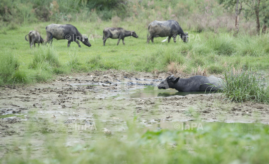 A buffalo cools off in a mud pond as other buffalo are eating grass on a scorching day in Noida, Uttar Pradesh, India, on, Aug. 18, 2020. Photo Credit: Indian Photo Agency (InPA)