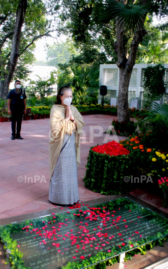 Congress President Sonia Gandhi offering floral tributes to former Prime Minister Indira Gandhi on her Martyrdom Day at the place of Martyrdom, 1 Safdarjung Road in New Delhi, India on Oct 31, 2021. Photo by Indian Photo Agency (InPA)
