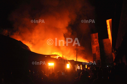 A huge fire engage three huge godowns at Bhuturia, in Agartala, Tripura, India evening on 6th September, 2013. One big rubber godown, one godown of Rod Iron, and One huga storage of LPG Gas Cylinders store. Twenty two fire engines and 360 fire fighters fight to douse fire with water canons since 5pm. Upto now fire is said to be under controlled by spraying foams on the gas stores. Photo by Abhik Deb/Indian Photo Agency (InPA)