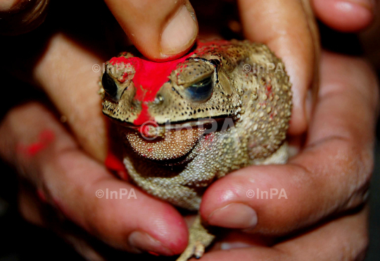 Farmers arranging a 'frog wedding' at a village in Sivasagar district of Assam, India on 16 June 2011. It is a popular belief that after this kind of wedding rain God pleases and adds to the delight of farmers. Photo by Luit Chaliha/ Indian Photo Agency (InPA)