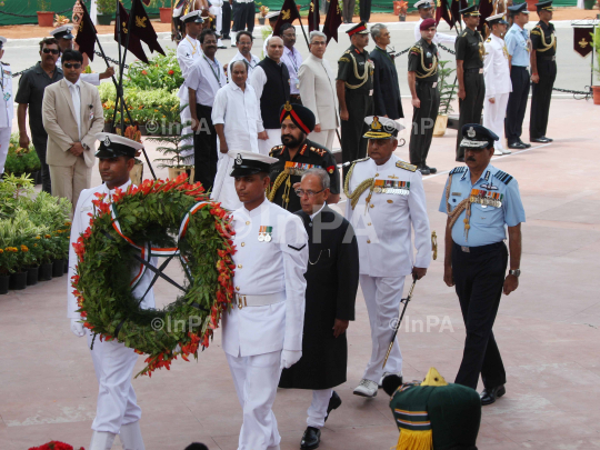 Independence day celebration at India Gate: President Pranab Mukherjee pays tribute to the martyrs at Amar Jawan Jyoti here on the occasion of the country's 66th Independence Day, at India Gate in New Delhi on August 15, 2012. The President laid a wreath at the Amar Jawan Jyoti at India Gate to mark the occasion. Mukherjee was accompanied by chiefs of Army, Navy and Air Force. Photo Credit: Indian Photo Agency (InPA)