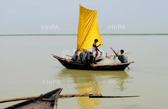 A fisher man fishing in a river at Panchananpur in Malda district, West Bengal on, 04/08/2011. Photo by Pankaj Ghosh/Indian Photo Agency