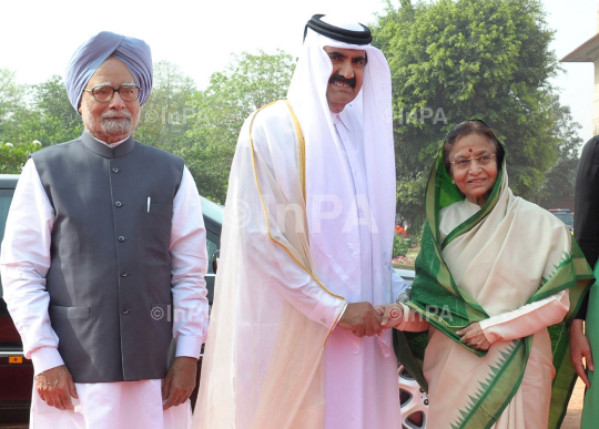 Indian Prime Minister Manmohan Singh, left, with the Emir of Qatar, Sheikh Hamad bin Khalifa Al Thani, center, along with Indian President Pratibha Patil, during the emir's ceremonial reception at the Indian Presidential Palace in New Delhi, India, Monday, April 9, 2012. Photo Credit: Indian Photo Agency