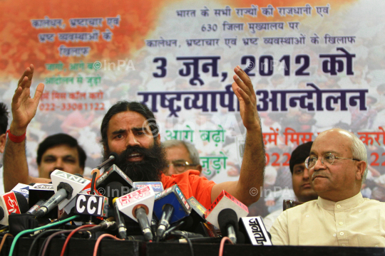 Yoga guru Baba Ramdev with Dr Ved Pratap Vaidik during a press conference to brief about the June 3 fast along with Anna Hazare at Jantar Mantar in New Delhi on June 1, 2012. He trained guns at the Prime Minister alleging that he is not "politically honest" and it is not anti-corruption activists but Manmohan Singh himself who is weakening the democratic traditions of the country. Photo Credit: Indian Photo Agency