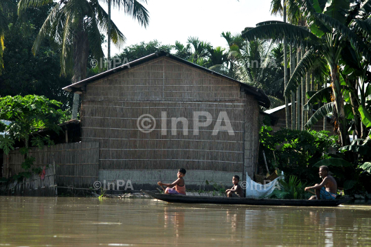 Flood victims travel on a boat to safer areas in flood affected Gorajan village in Nagaon, Assma on Sunday, July 01, 2012. Photo by Anuwar Hazarika/Indian Photo Agency