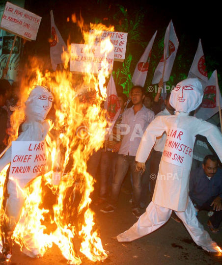 Activist of All Assam students Union (AASU )burn the effigy of Tarun gogoi chief minister of Assam,Manmohan Singh prime minister of India and MPs of different political parties of Bangladesh who is in a tour to Assam in regard to India Bangladesh land issue Guwahati on Sunday 2nd December 2012 Photo: DASARATH DEKA