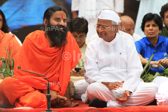 Veteran Indian social activist Anna Hazare with Indian Yoga Guru Baba Ramdev during his day-long hunger strike against corruption in New Delhi June 3, 2012. Hazare and Yog guru Baba Ramdev are holding a daylong fast to press the government to act against widespread graft and bring back hundreds of billions of dollars stashed overseas. Photo by Shweta/Indian Photo Agency